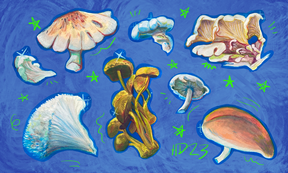 Contour-cut mushroom stickers with a bright blue background, and the blue mushroom print. Perfect for the mycologist in your life. These will hit the mail on May 5.